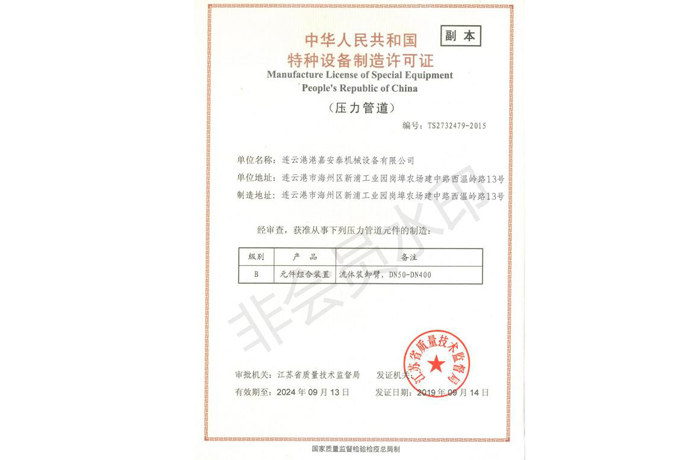 資信等級證書裝車鶴管適用于汽、煤、柴油,液態化工介質汽車、頂部裝卸車。裝車鶴管可以分為三類,分別是:全自動鶴管、氣動帶手動鶴管、手動鶴管。裝車鶴管還有三個特殊功能,分別是:氣相回收,伴熱保溫,變形產品。 鶴管操作規則流程: a.鶴管在裝車前,操作人員需要對油庫油臺設施的完好性進行檢查,檢查靜電接地線,確保油車主梁上緊固有效。 b.靜電接地線應在卸油前連接好;按規定做好穩油靜置工作 c.將溢油探頭放至油缸口安全高度位置 d.在鶴管裝卸油結束后,需將尾管里的余油、氣體排空后才能提出放置原來位置。<了解詳情>